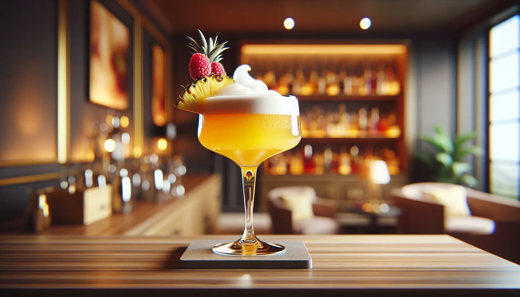 A lemon twist adds aroma and brightness. A fresh raspberry brings color and a hint of tartness. A small pineapple leaf is a fun, tropical touch.